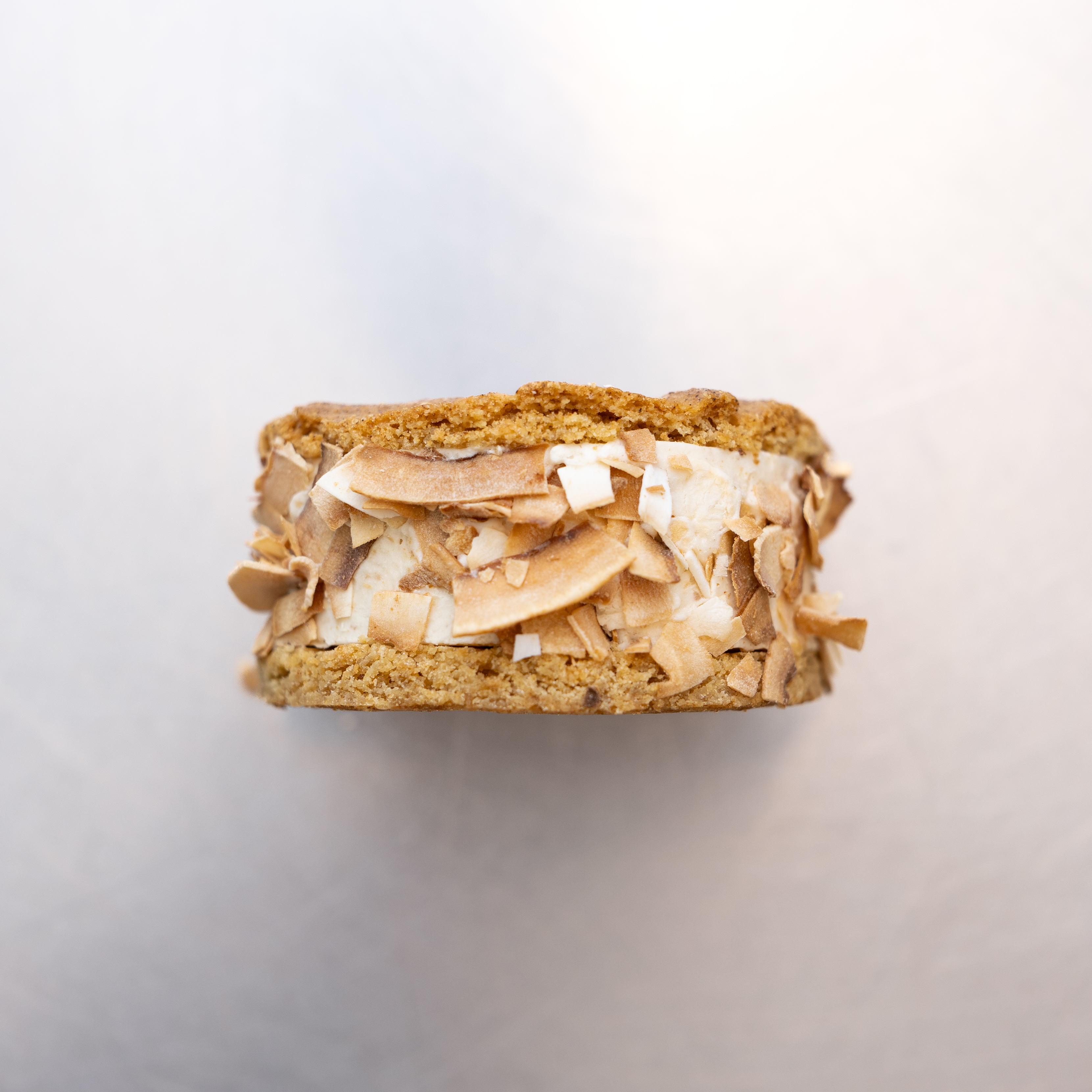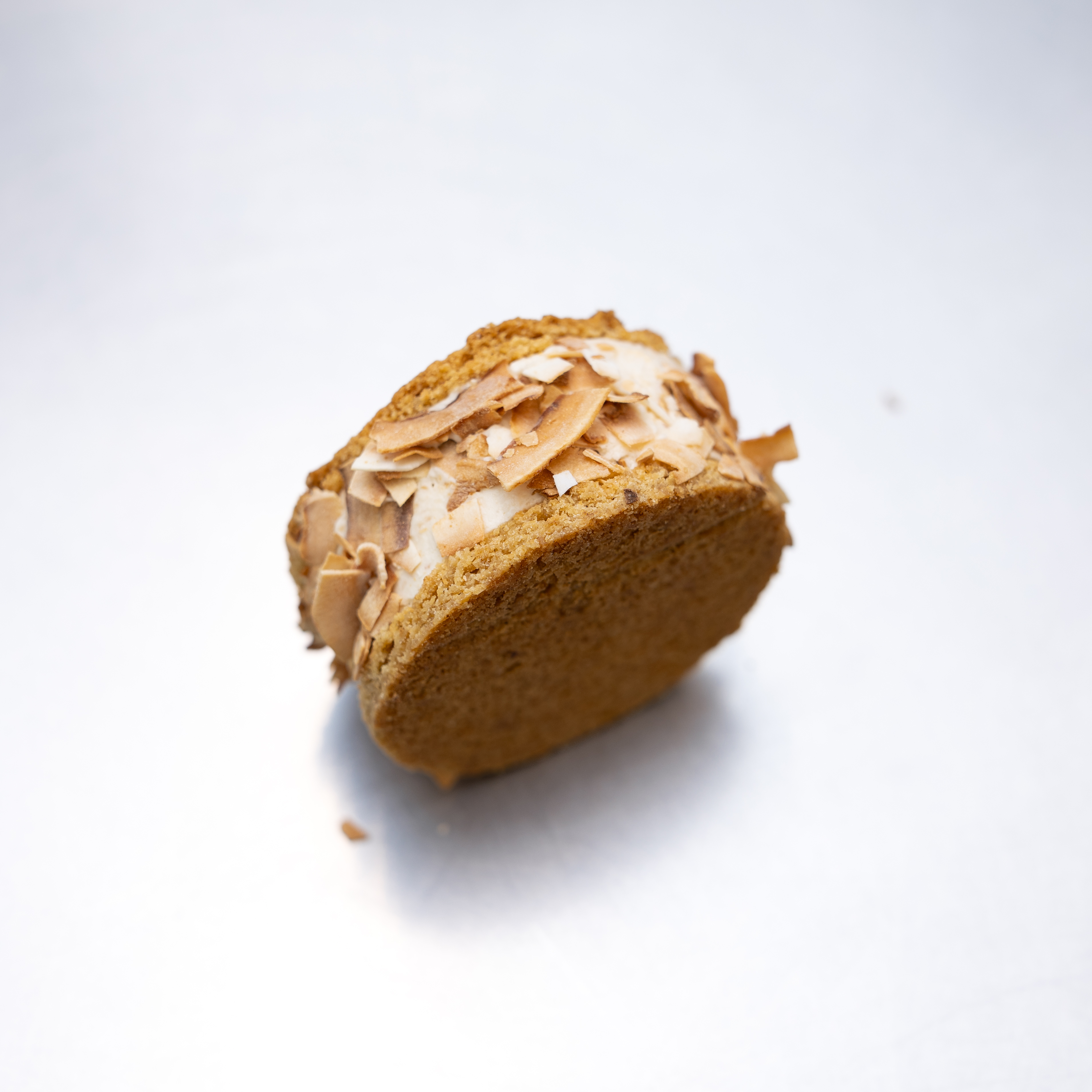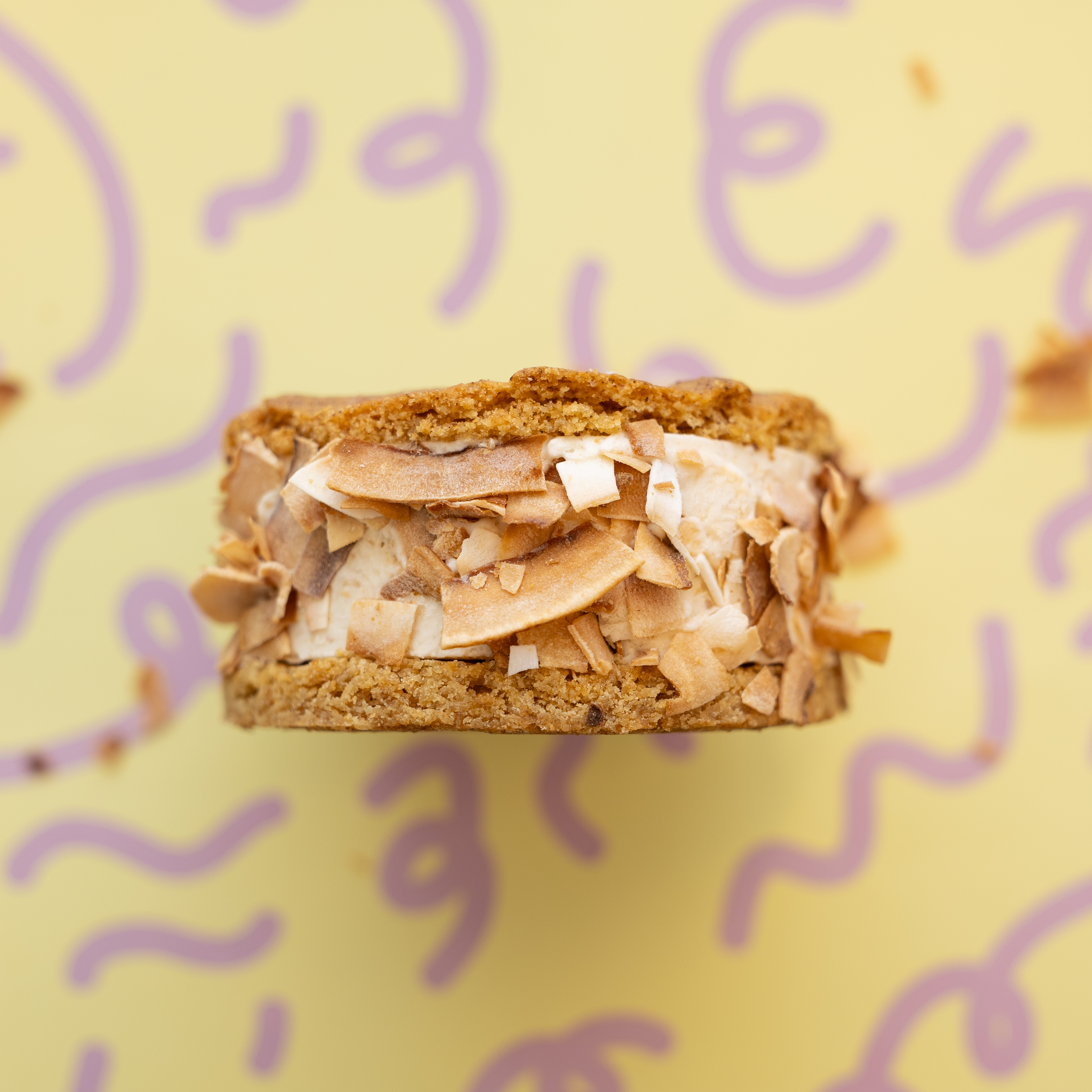 Alfajor helado de Coco, con centro de caramelo de maracuyá, tapas de blondie y coco crocante.