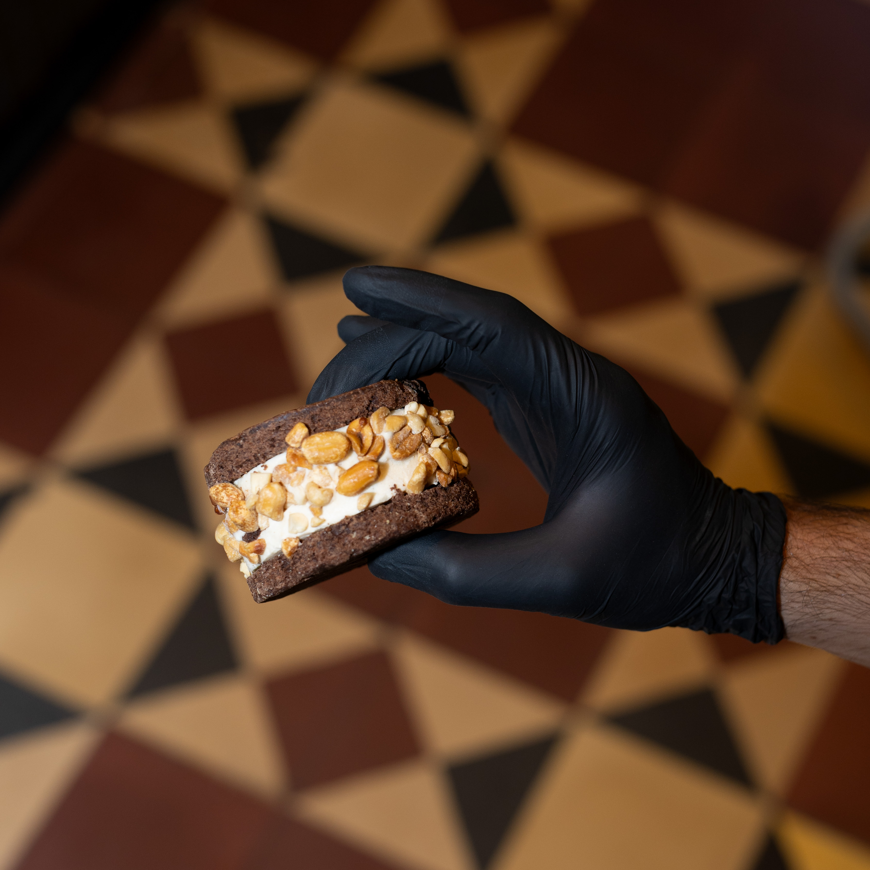 Alfajor helado de Maní, centro de caramleo salado y tapas de brownie. Terminado con maní tostado.