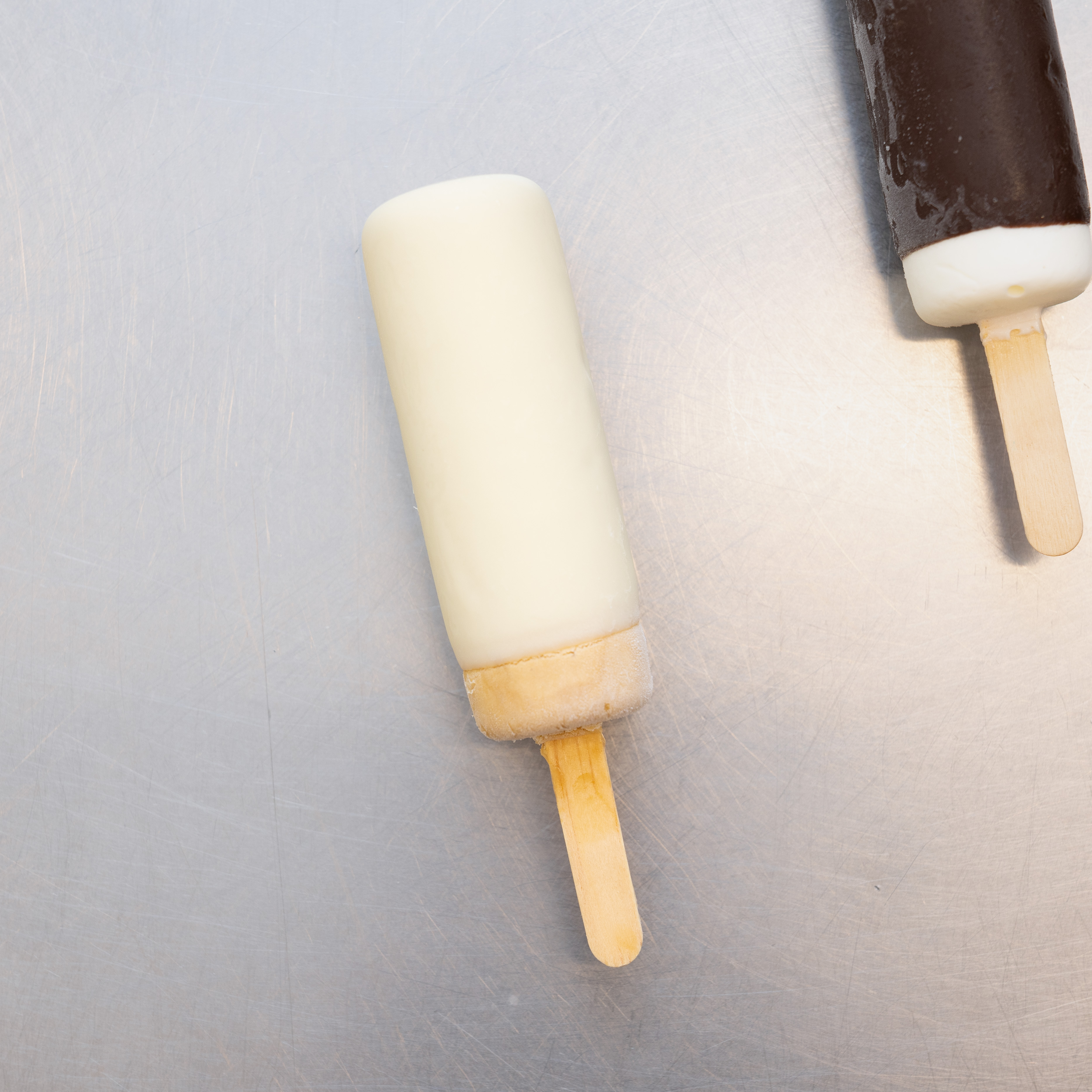 Barrita helada de Dulce de Leche con baño de chocolate blanco.