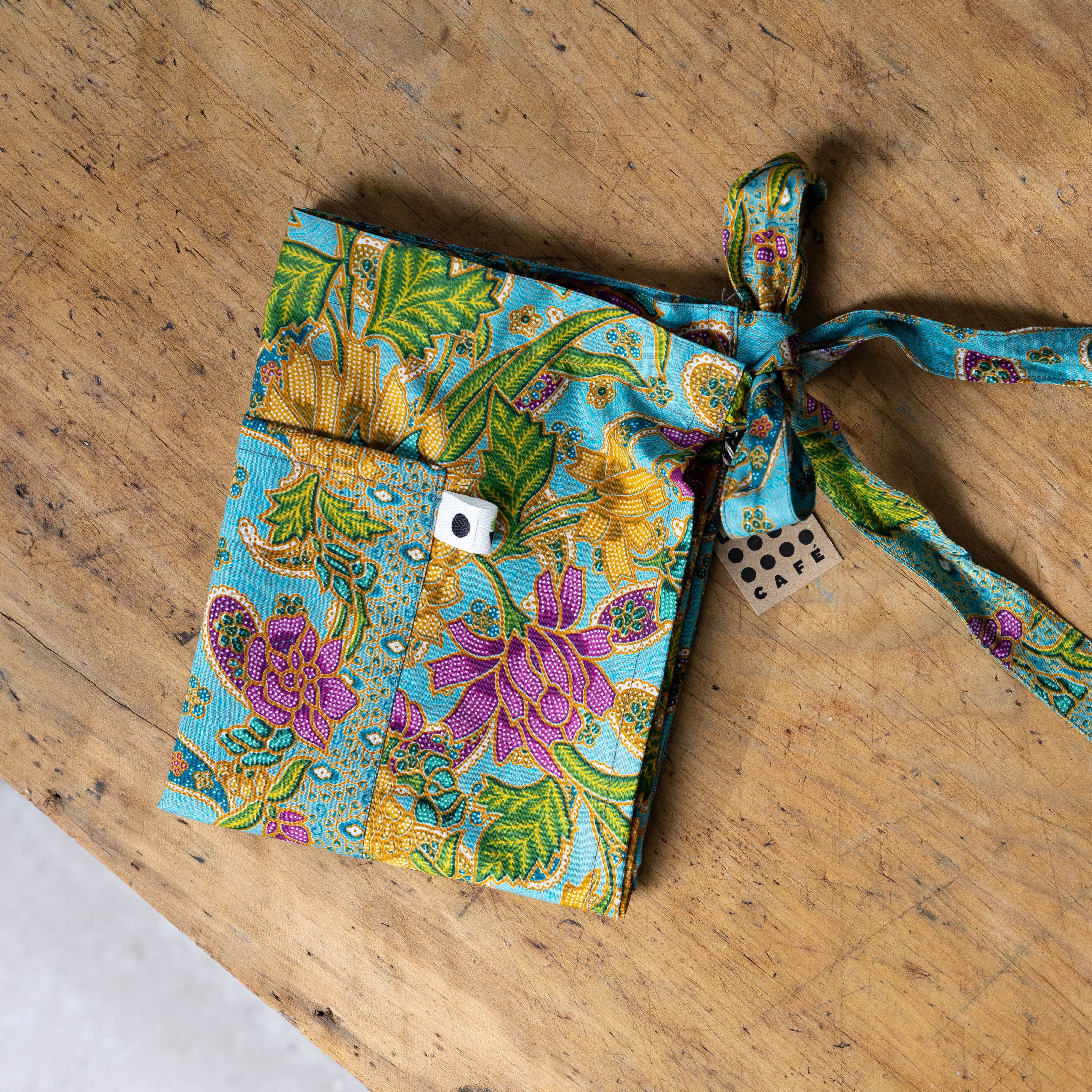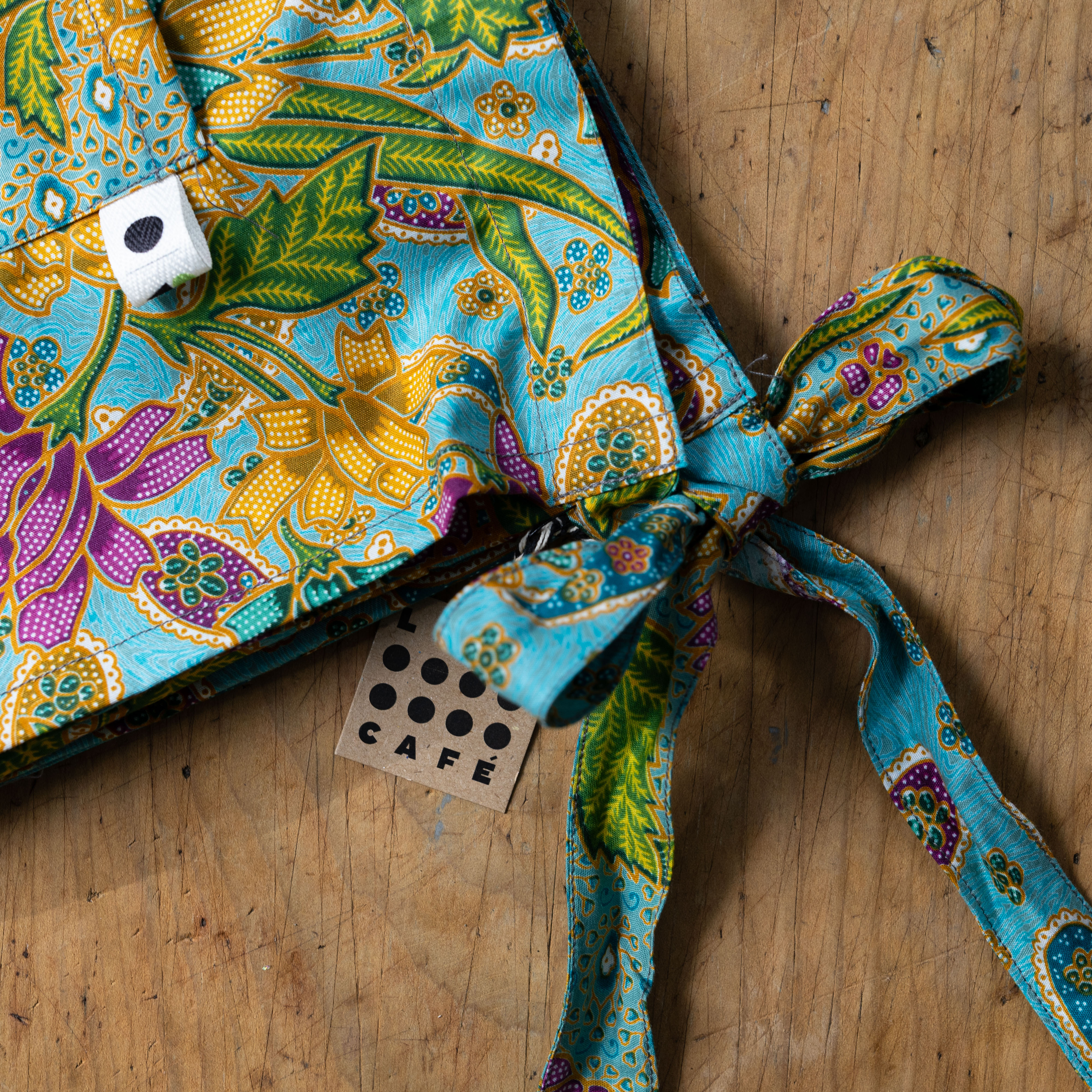 Cada delantal está hecho a mano, con telas traídas directamente de Tailandia. Hay muy pocas unidades de cada diseño, lo que los vuelve únicos y especiales. Confeccionados a mano, cada uno guarda la huella del trabajo manual, de las costuras imperfectas y del tiempo dedicado a su creación.