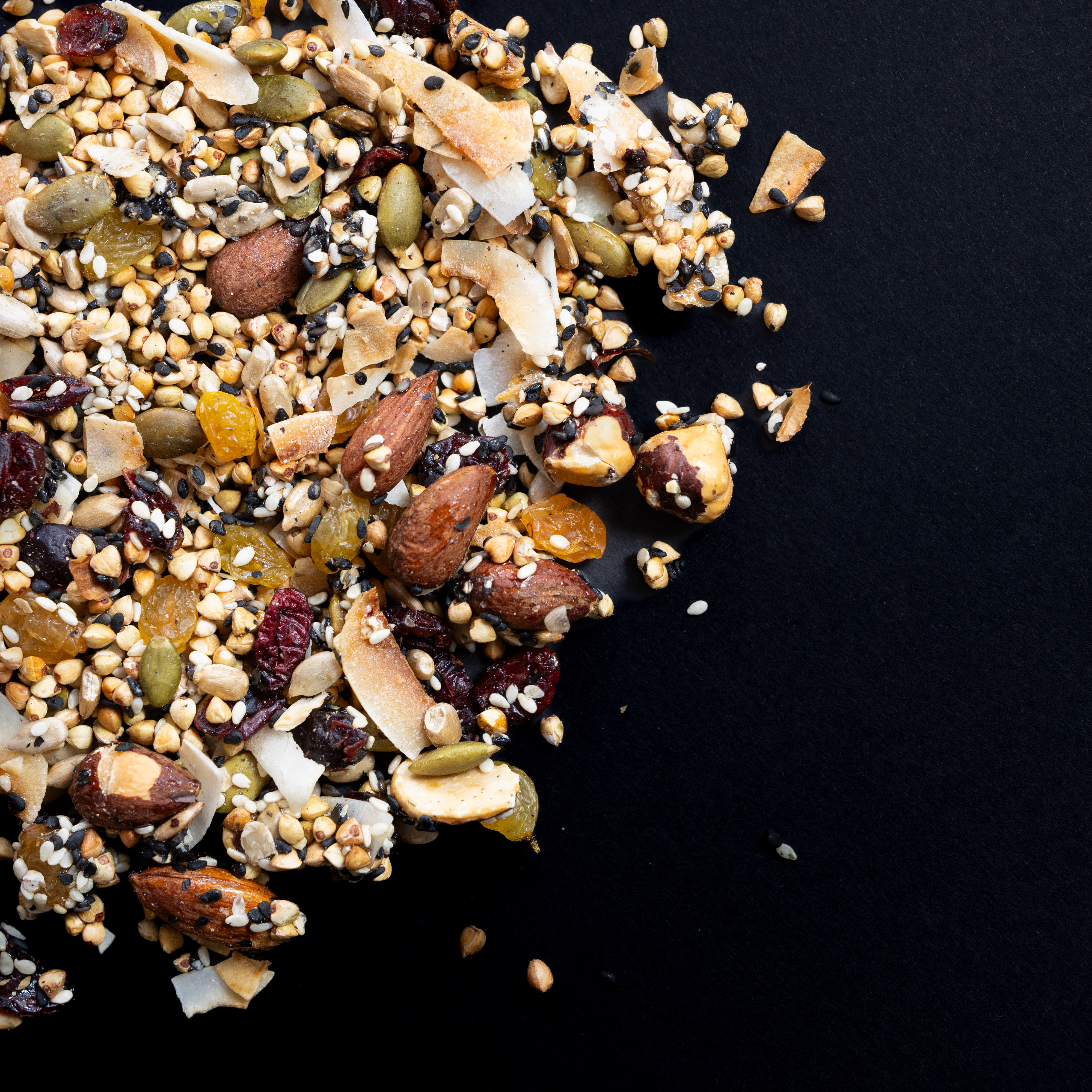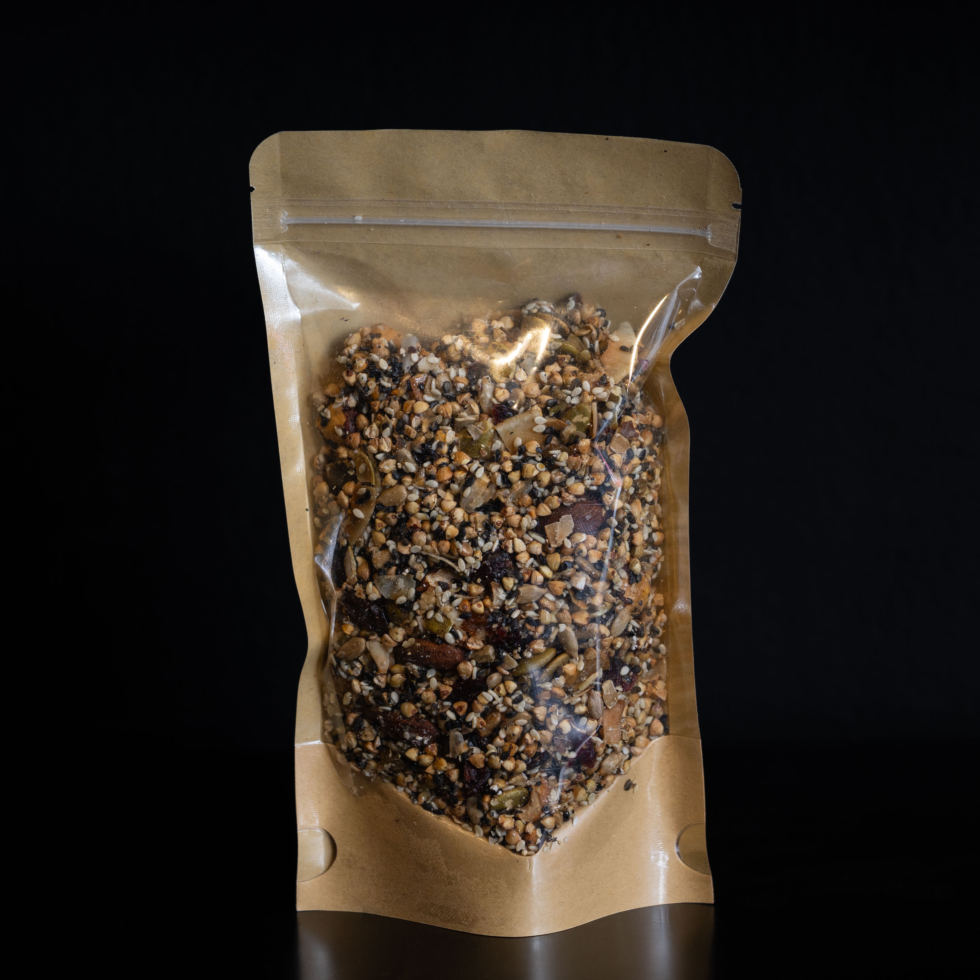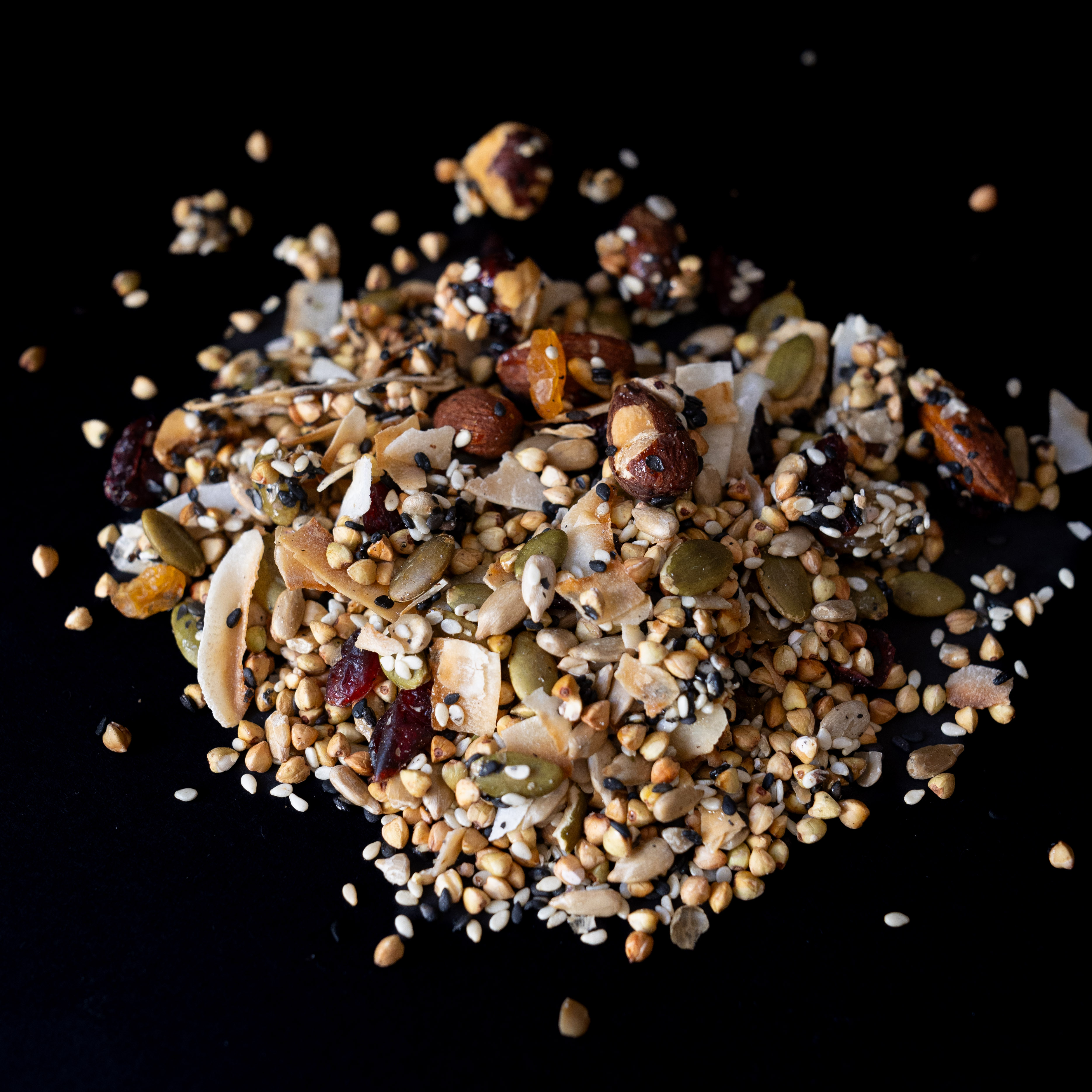 Granola dulce realizada con trigo sarraceno, frutos secos, miel y semillas. Realizada artesanalmente y en pequeños lotes en nuestra cocina.