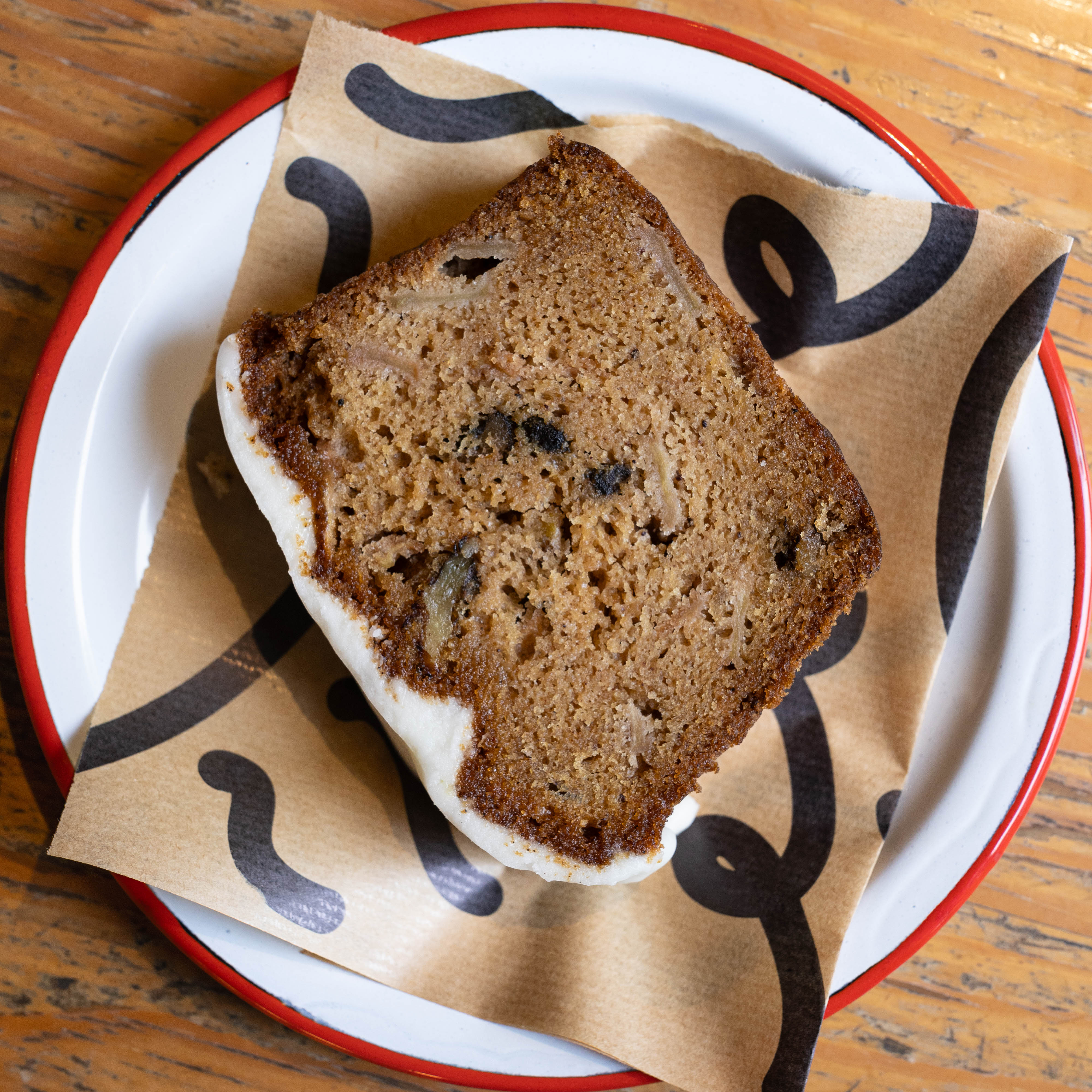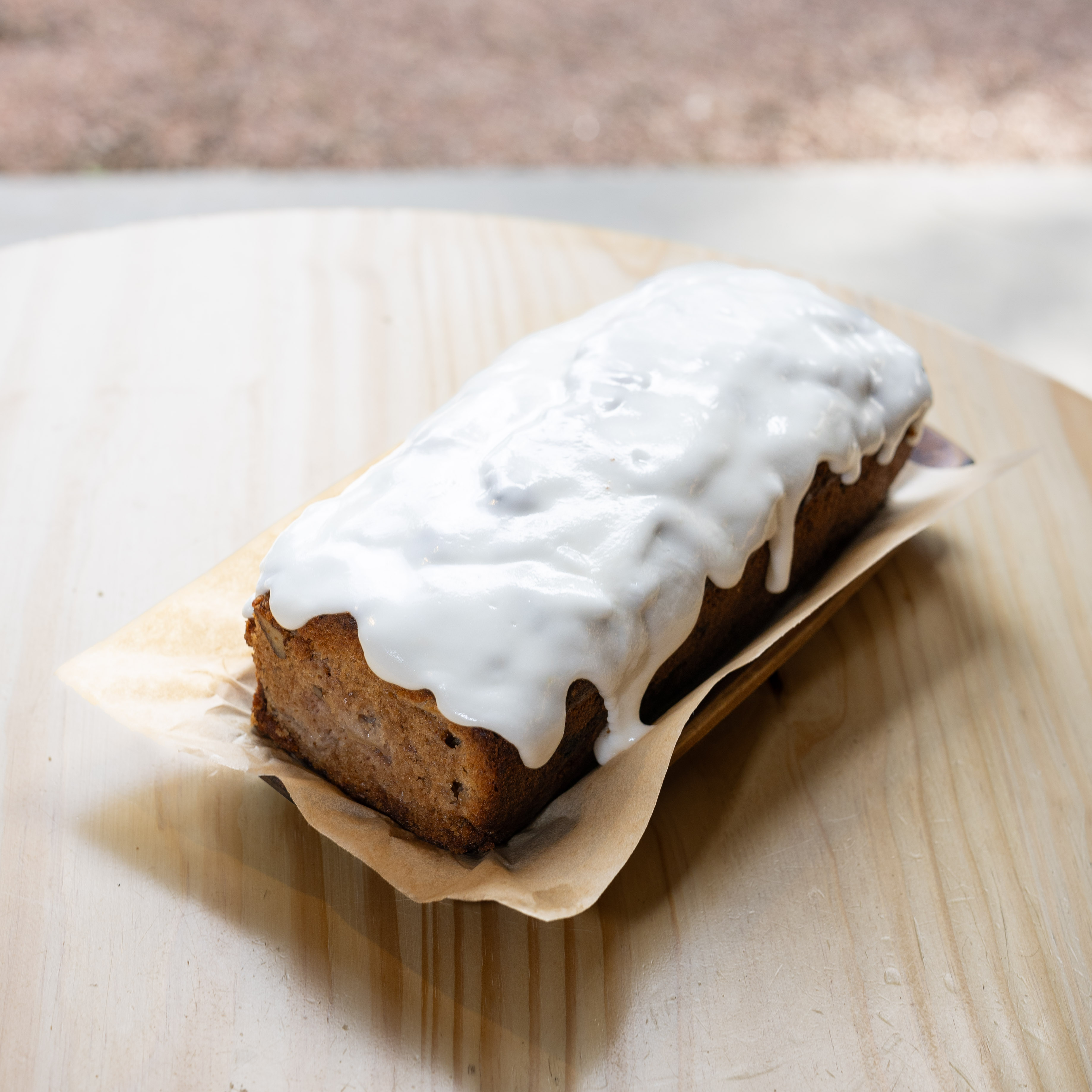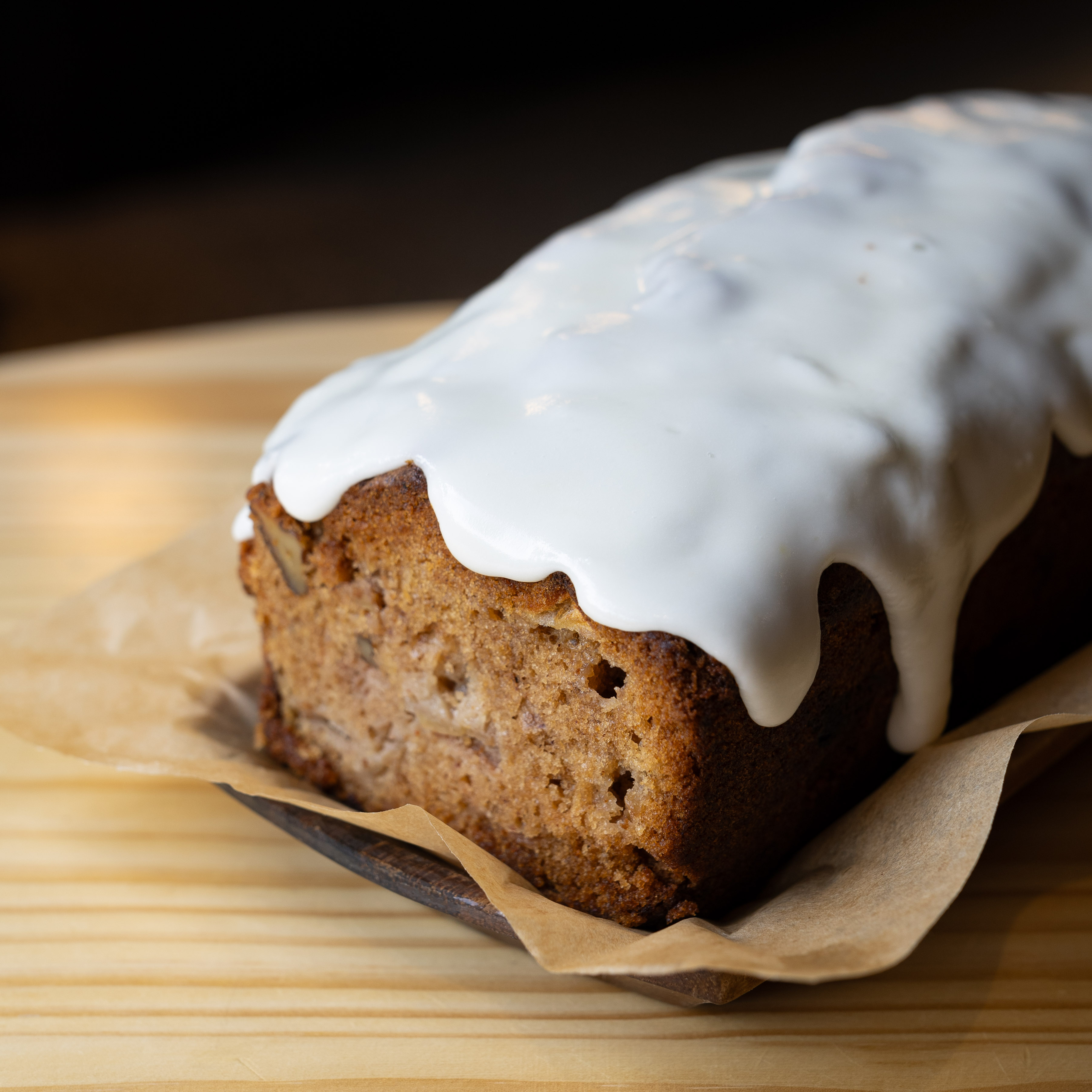 Budín húmedo de manzanas y nueces con glacé de limón.